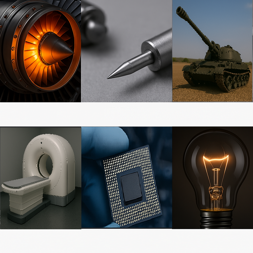 钨金属以其极高的熔点和密度而闻名,广泛应用于照明、电子、半导体和熔炉等高温设备。其卓越的硬度和耐磨性使其成为航空航天、国防和硬质合金工具行业的关键材料。此外,钨还用于核工业的医学成像设备和辐射屏蔽,凸显了其在高科技和战略领域的重要性。